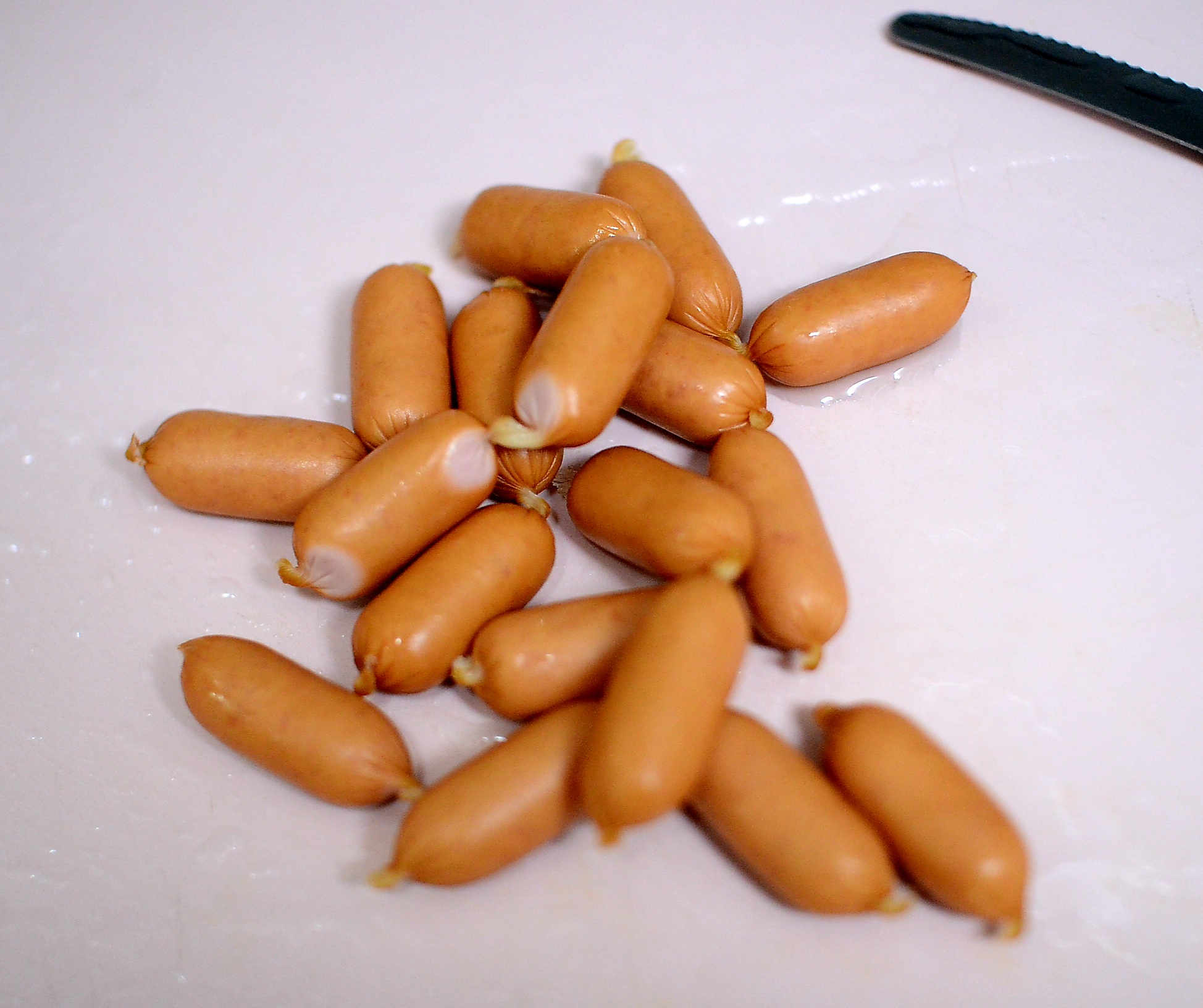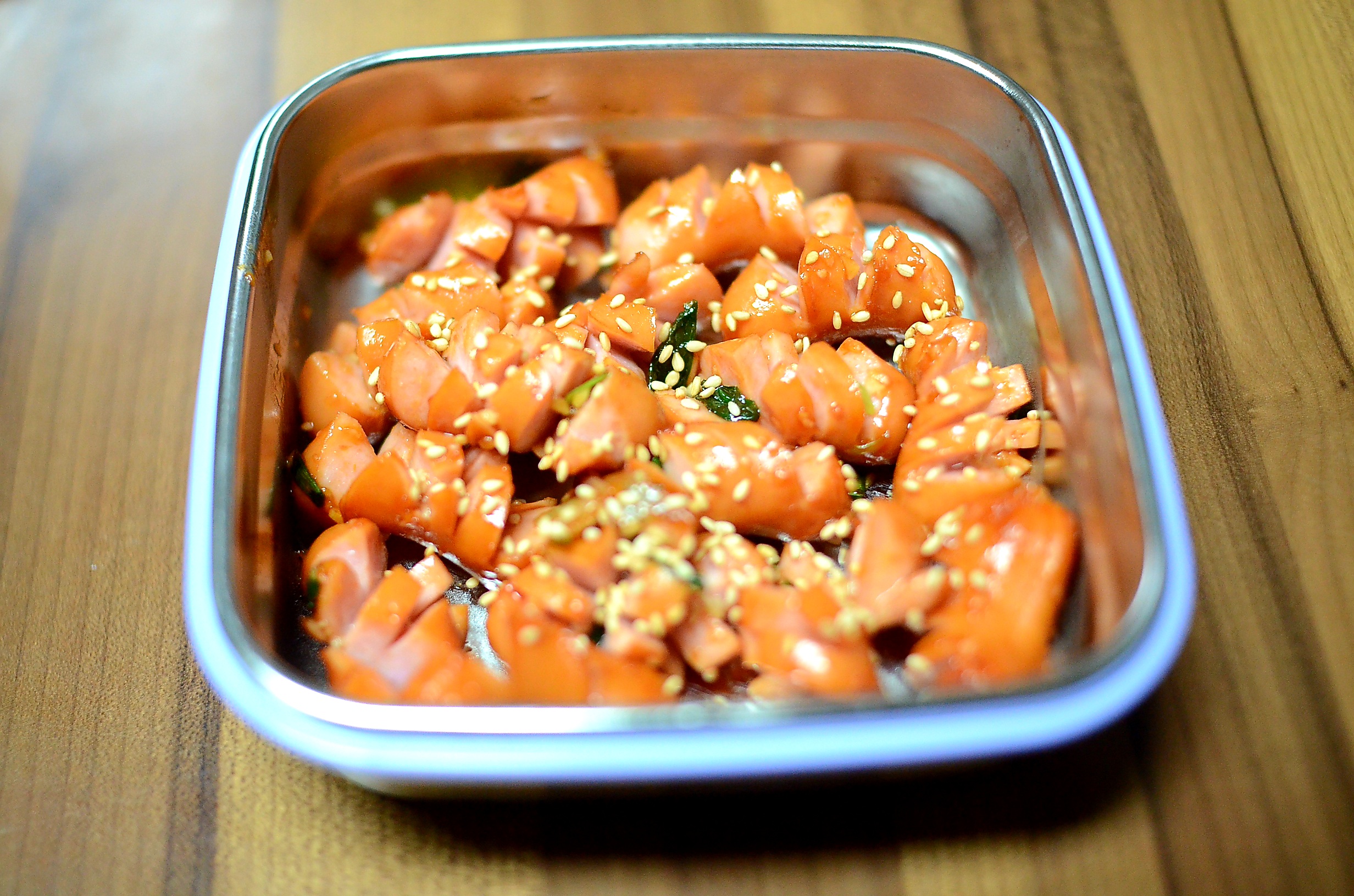 소세지는 잘 씻어서 뜨거운 물에 한번 헹구고 (보통은 데쳐서 사용함)