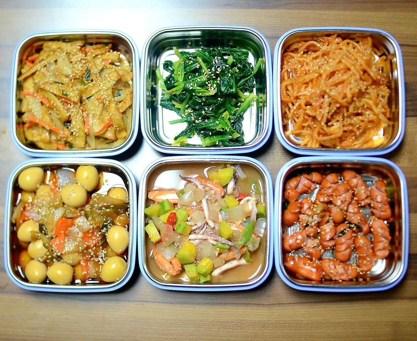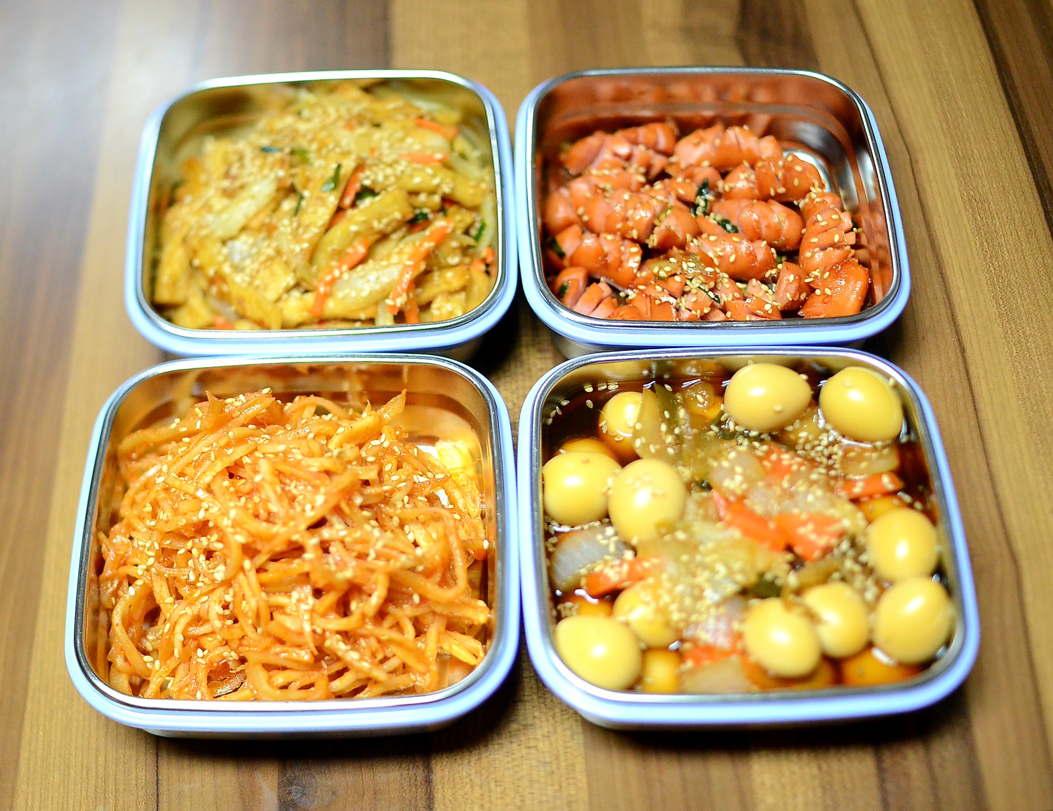 처음 네 가지는 자주 하는 어묵야채볶음, 진미채고추장 볶음, 메추리알 장조림, 소세지 볶음으로 해봅니다.
