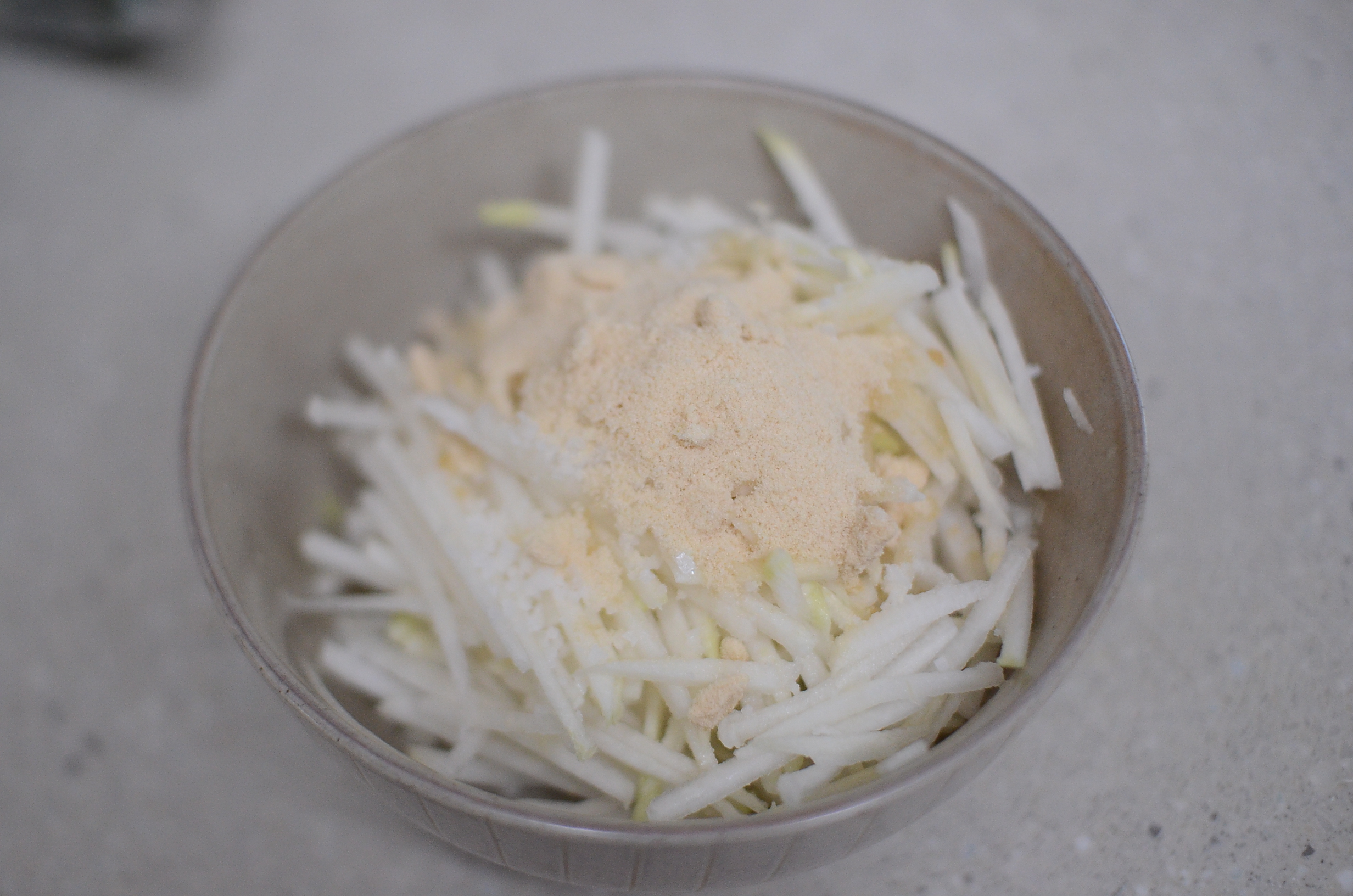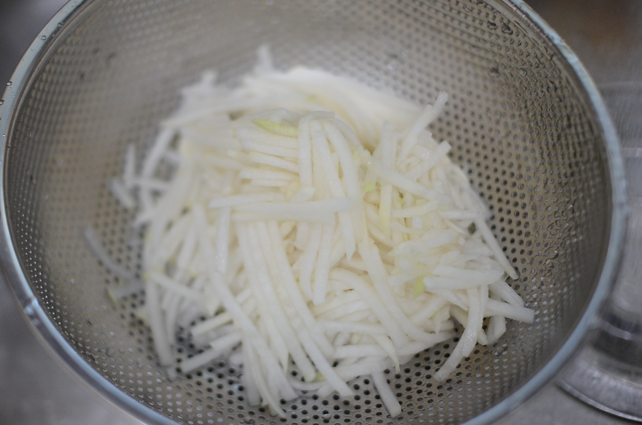 무를 채썰고, 굵은 소금과 설탕으로 재어 놓고