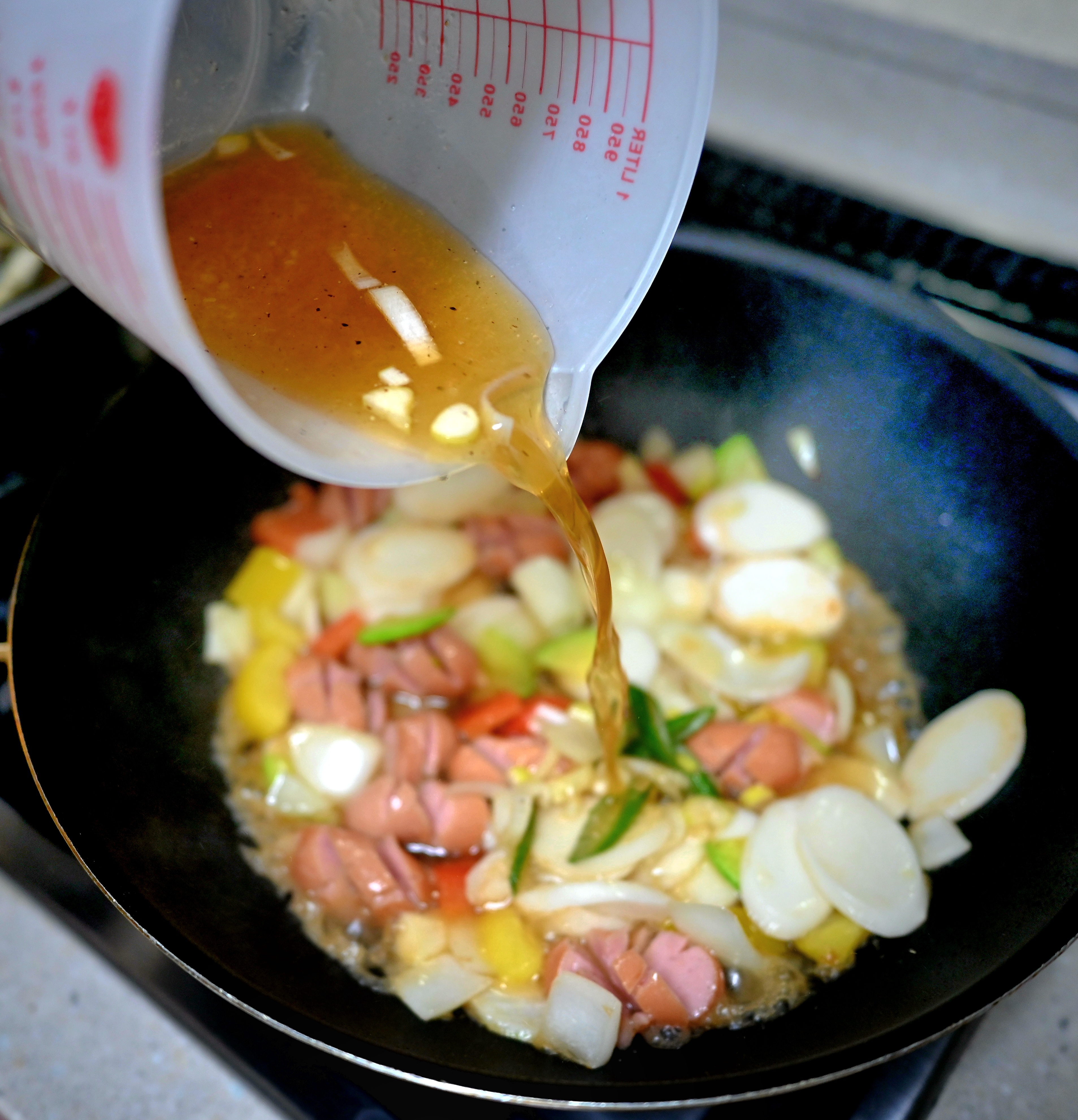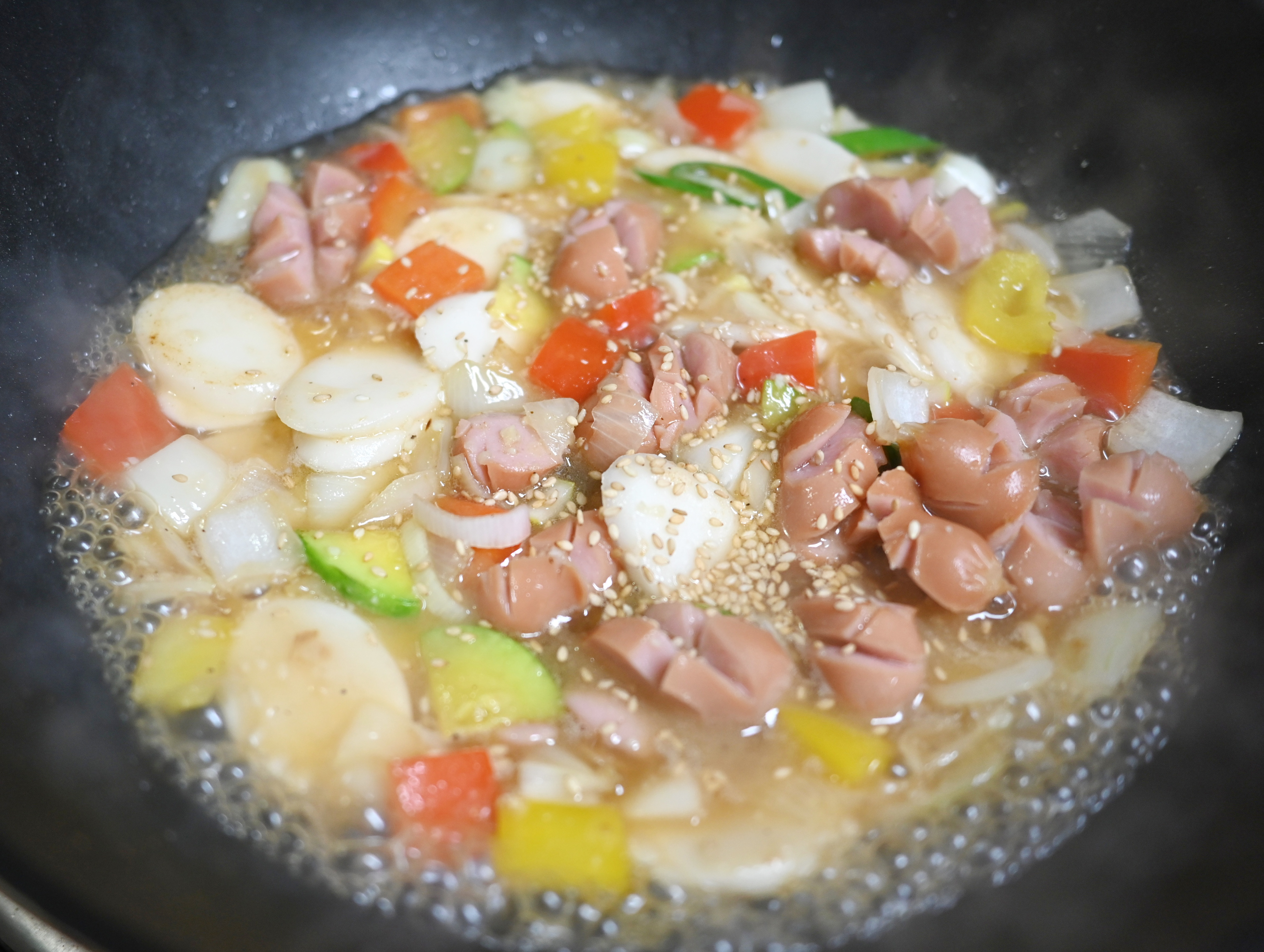 웍에 기름을 두르고 야채를 볶다가 소시지와 떡을 넣고 같이 볶아 줍니다.