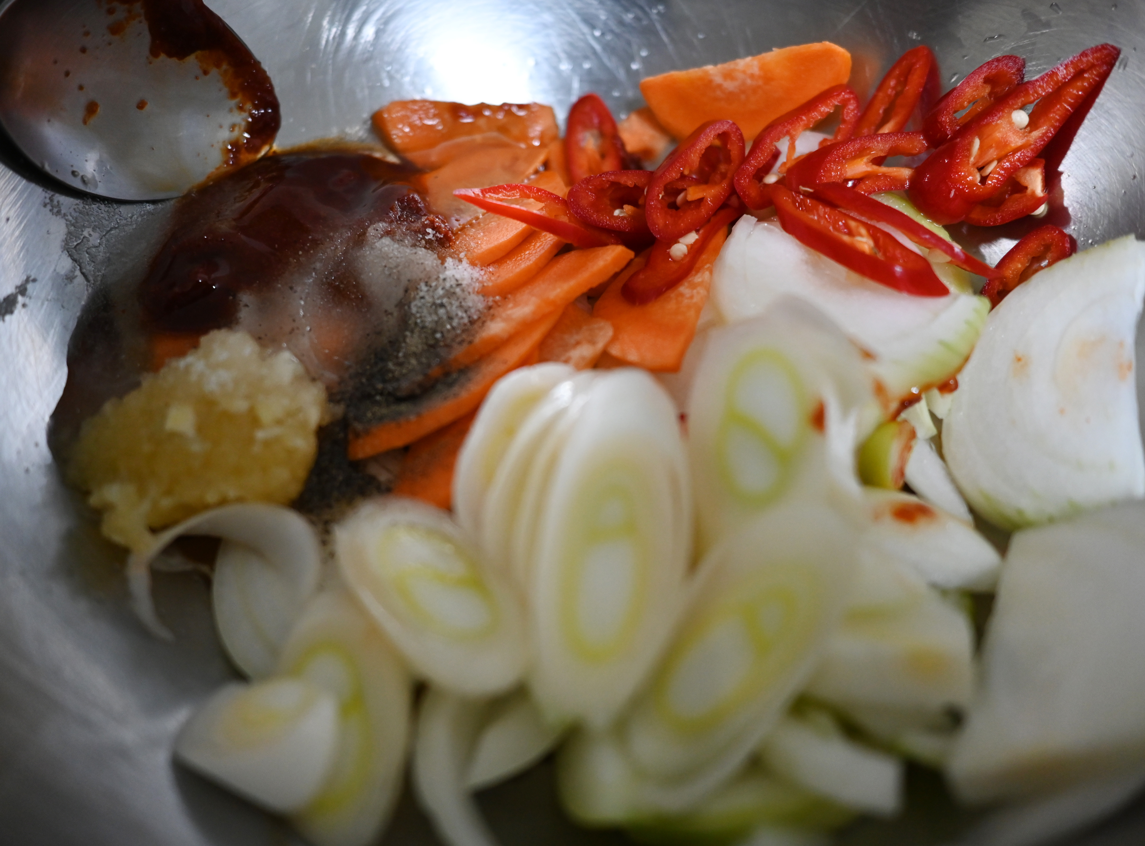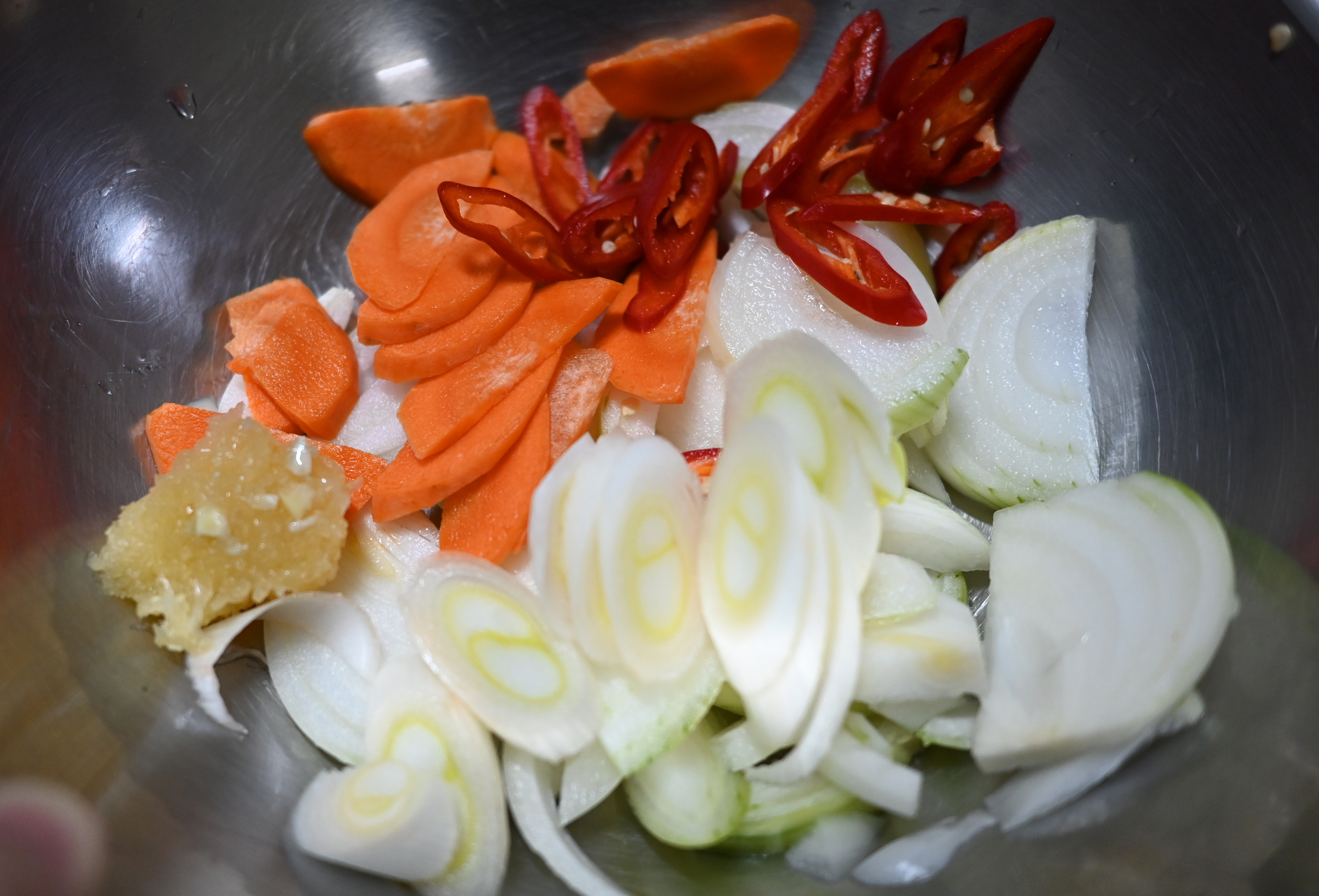 냉장고를 열어보니 대파, 양파, 당근, 홍고추 등이 있어서 썰어서 준비 하고