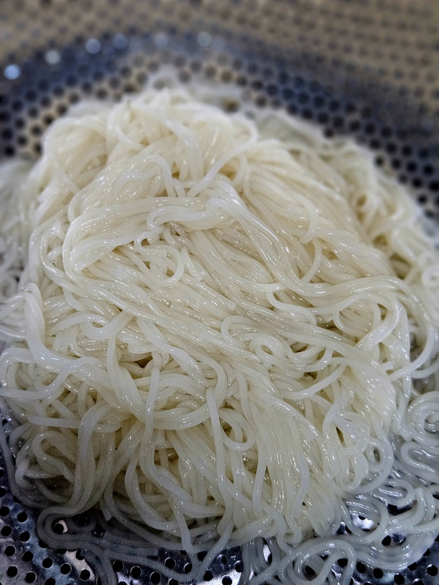 찬물에 헹궈서 잘 물기가 까지게 둡니다.