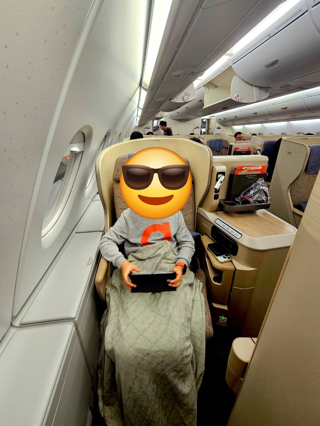 들어가서 비즈니스 1인석에 착석하는 아들이